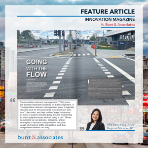 Bunt is the leading transportation planning and engineering consulting firm in Western Canada, with five offices located in Calgary, Edmonton, Kelowna, Vancouver, and Victoria. Our team of over 60 transportation engineers, planners, technologists, and support staff are fully committed to providing exceptional services. This commitment has resulted in Bunt being the preferred transportation consultant for hundreds of repeat public and private sector clients for over 30 years.