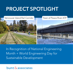 We envision a future where all communities are healthy and connected in equitable and sustainable ways. At Bunt & Associates Engineering Ltd. (Bunt), we prioritize people, integrity, and teamwork in all aspects of what we do to achieve successful outcomes. Our mission is to foster relationships with clients and stakeholders, engage diverse perspectives, encourage curiosity and innovation, and be experts today and tomorrow.