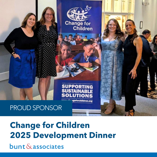 Bunt & Associates was proud to once again sponsor our long-standing charitable partner, Change for Children, at their Development Dinner on September 27, 2025. Janelle Willis, Catherine Oberg, Alyssa Lefebvre, and Nicole Farn from our Edmonton office had a wonderful evening celebrating the inspiring work of Change for Children.